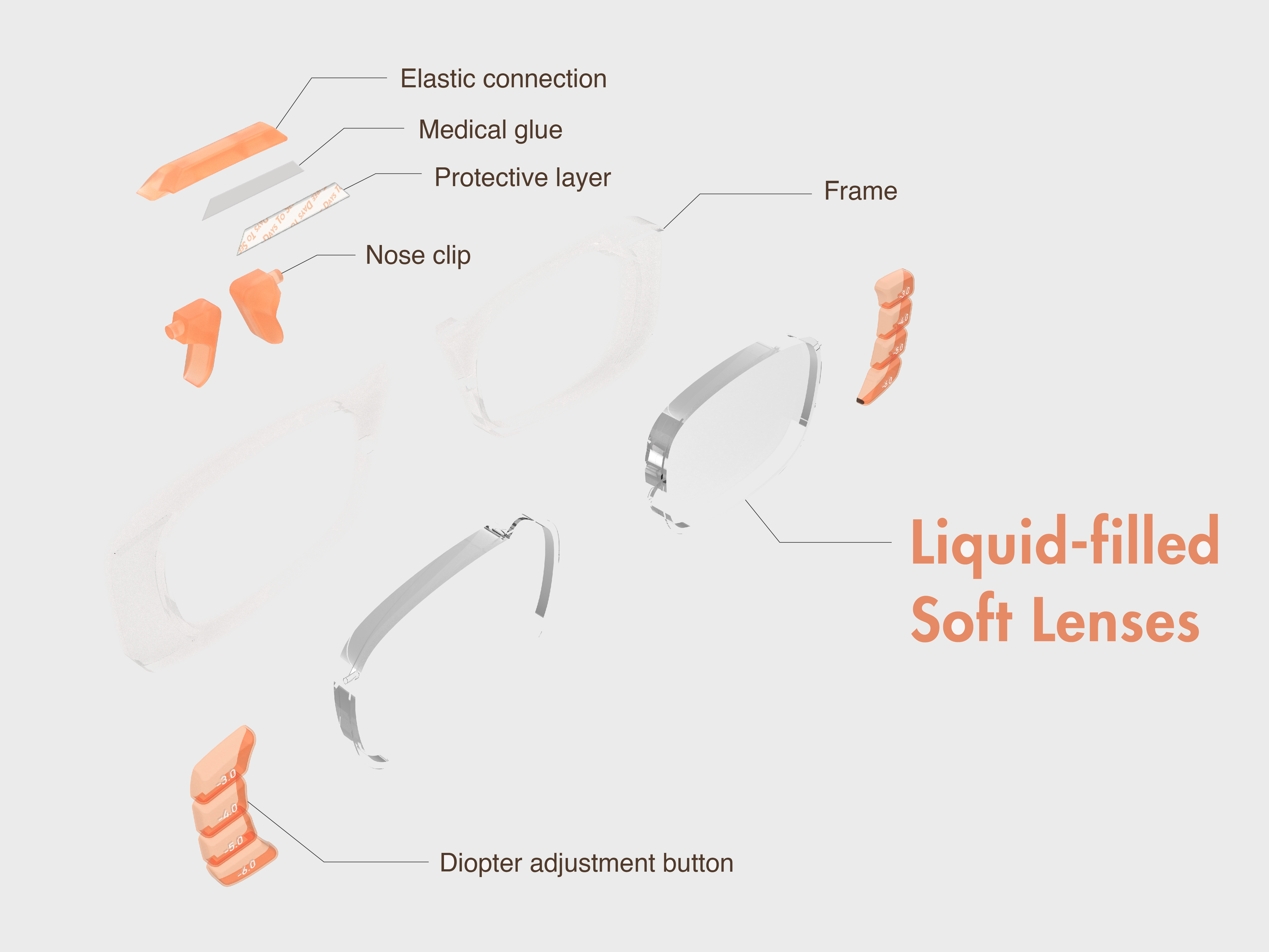 A syringe-based system was our first instinct — but testing showed it was too complex for a panicked user. Instead, we designed a button-based structure: liquid is stored in reservoirs on both sides of the frame and injected into the lens by pressing the button. Crucially, the button doesn't spring back, meaning each press is a one-way ratchet toward the correct setting. No reverse action, no fine motor skill required.